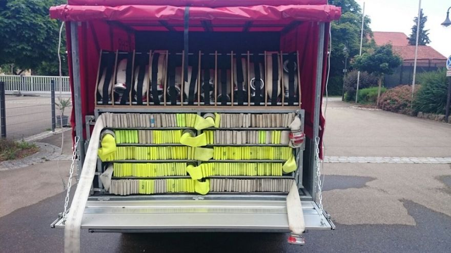 Planung und Herstellung von Tandem-Schlauchanhängern für Feuerwehrfahrzeuge. Die Anhänger beinhalten ein Trägergestell für 10 Schlauchschubladen, Staufach für 12 B-Schläuche, Zwischenboden für Tragkraftspritze samt Halterung für 6 Saugschläuche sowie Staufächer für Zubehör. Das zul. Gesamtgewicht beträgt 2.700 kg